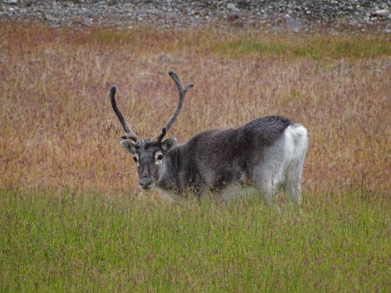 Zondag 26 augustus is de Plancius aan de westkant van Nordaustlandet verder gevaren. 's Morgens hebben we een zodiaklanding gemaakt bij Relikbukta in de Wahlenbergfjorden. De passagiers werden ook hier weer in groepen verdeeld. Natuurlijk gaat met elke groep een gids mee met een geweer, want op geheel Svalbard (Spitsbergen) kun je oog in oog met een ijsbeer komen te staan. Gelukkig waren het rendieren die Aadje tijdens de wandeling heeft gespot.