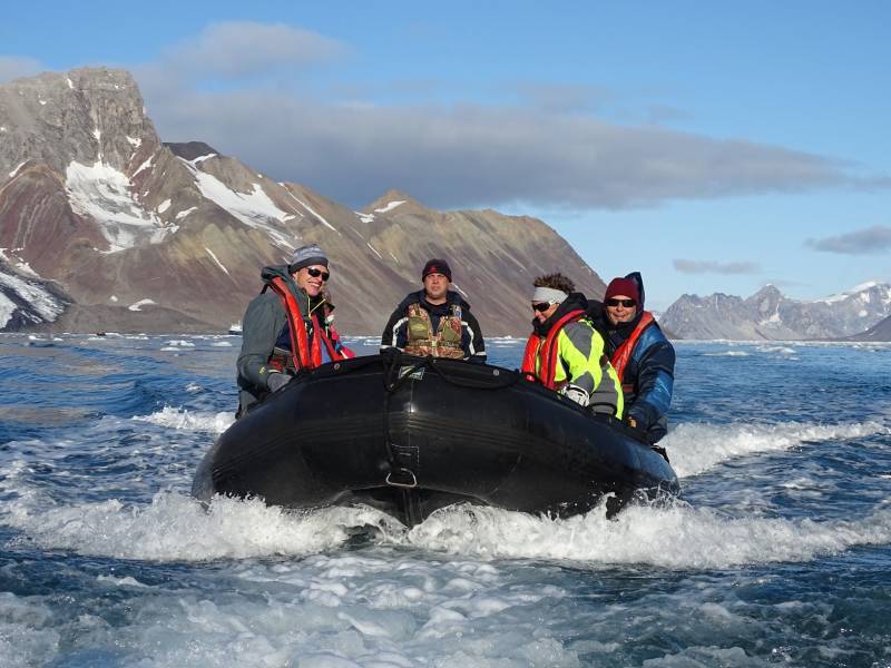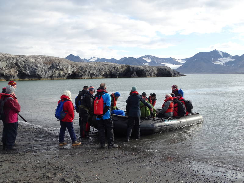 Maandag 20 augustus ben ik door de taxi afgezet op de kade in Longyearbyen. De Plancius lag echter niet aan de kade, maar in het midden van het fjord. En wat een verrassing dat alle passagiers, maar ook mijn bagage, met een zodiak naar het schip werden gebracht! Gaaf!