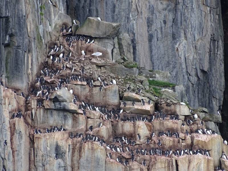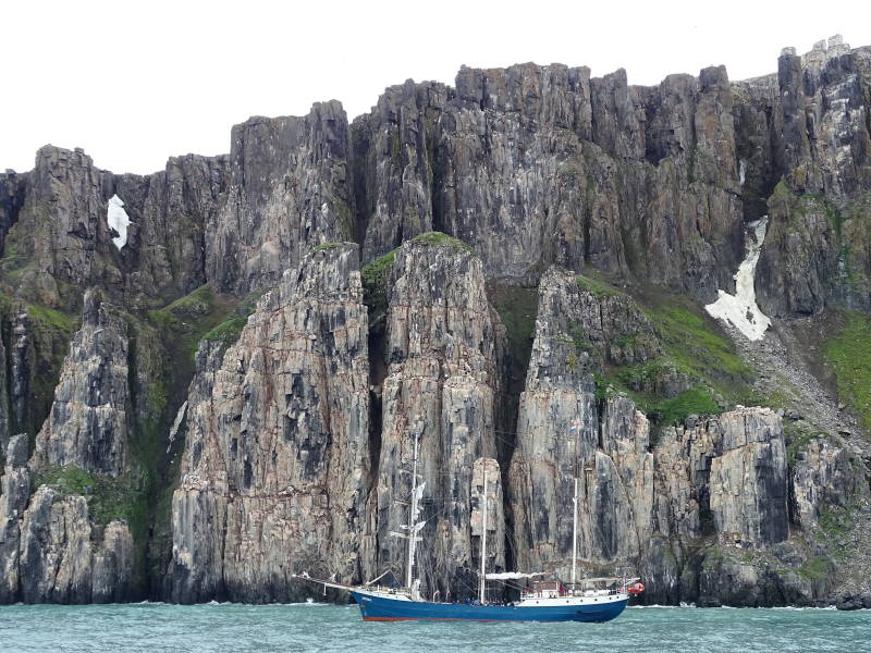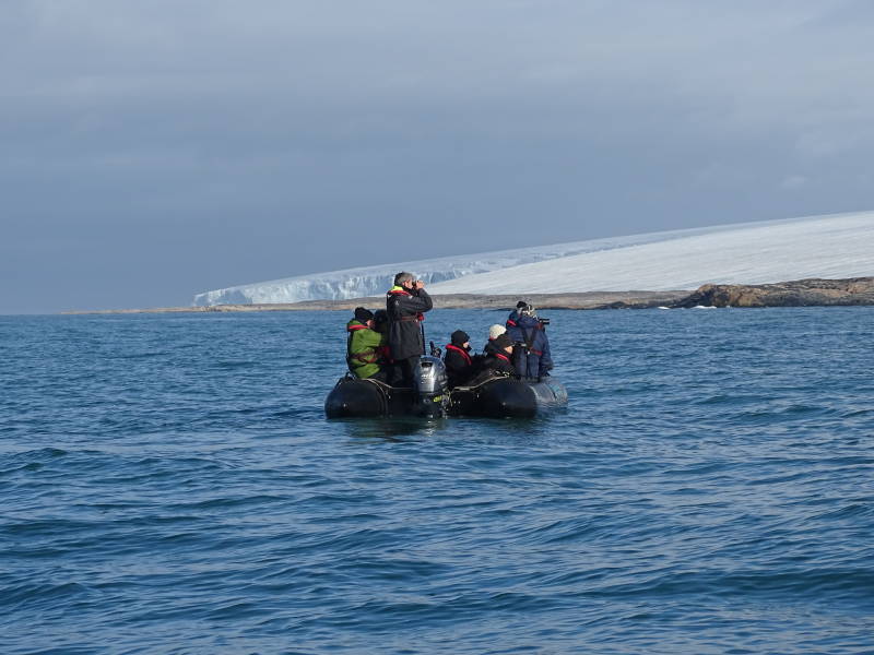 Woensdag stonden er weer 2 activiteiten op het programma. Allereerst de volgelrotsen van Alkefjellet. We zouden hier in de ochtend een zodiakcruise maken, echter er stond te veel wind (20-25 knopen). Gelukkig kon Aadje vanaf de Plancius de vogelkliffen goed bekijken. Op de randen van deze kliffen zat een enorme kolonie dikbekzeekoeten. Daarnaast o.a. grote burgemeesters, drieteenmeeuwen en noordse sterns. Boven deze kliffen ligt ook de ijskap van Nordaustlandet; die bedekt maar liefst 80% van dit eiland met ijs. Ook heb ik op deze vogelkliffen een poolvos gespot! Woensdagmiddag was een zodiaklanding gepland in het zuidelijke deel van de Hinlopen straat. Met de zodiaks zijn we naar een strand gevaren van Nordaustlandet en daar hebben we een natte landing gemaakt. Dat wil zeggen dat er geen aanlegsteigers zijn en dat je vanaf de zodiak in het zeewater stapt. Gelukkig heeft Aadje op de plancius een paar goede laarzen tot aan de knie gekregen, zodat de voetjes gelukkig droog bleven!