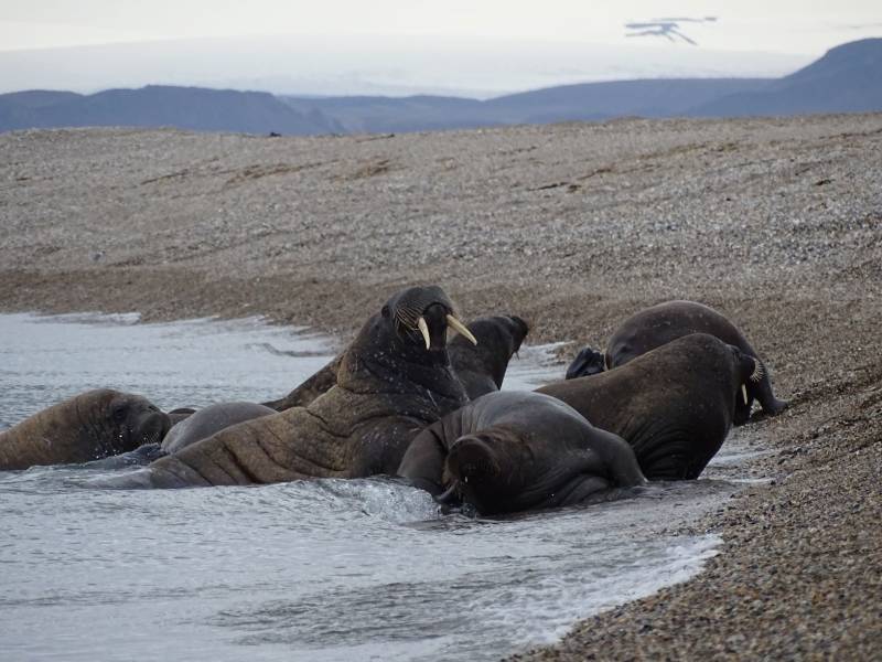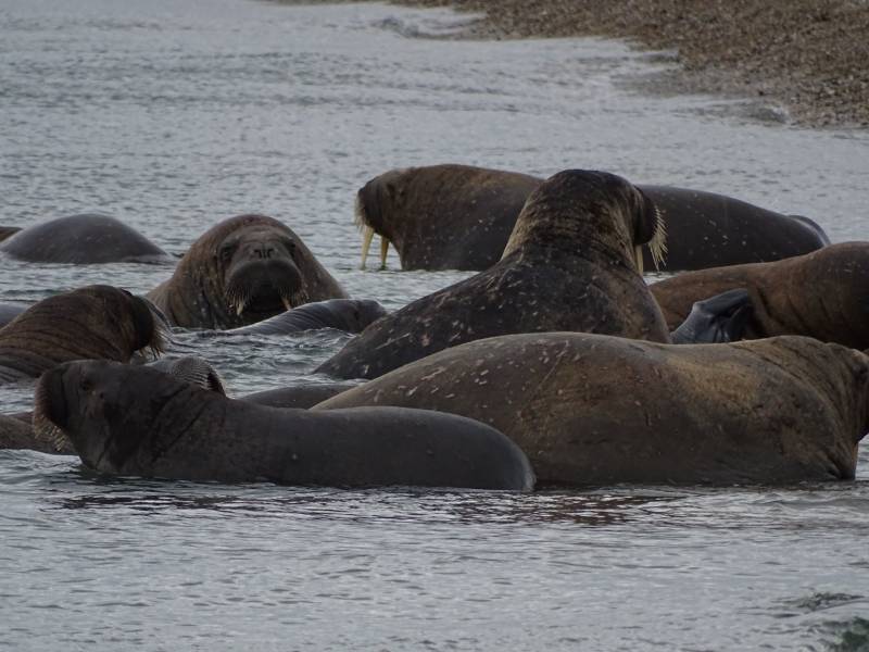 Vanaf een paar honderd meter zijn we onder begeleiding van de gidsen zeer stil richting de walrussen gelopen (niet praten, kleine rustige stappen nemen en geen camerageluiden). Op zo'n 100 meter afstand hebben we de walrussen kunnen spotten. Er lag ook een hele familie walrus in het zeewater en een enkeling was heerlijk aan het zwemmen. Gaaf hoor om die reusachtige beesten te zien. Een walrusmannetje kan maar liefst 3,5 meter lang worden en weegt dan zo'n 1800 kilo!