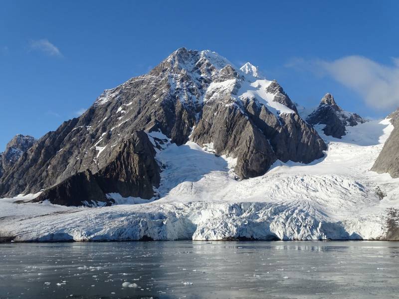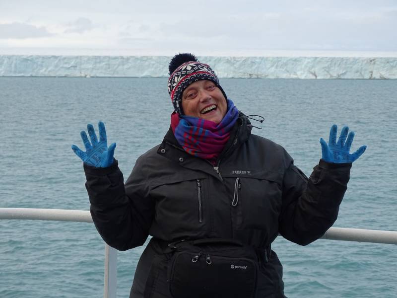 Na het ontbijt was het weer de gebruikelijke verkleedpartij. Aadje heeft zich goed ingepakt, want dinsdagmorgen gingen we een 2,5 uur durende zodiakcruising maken bij een gletsjer in de Hornsund in het zuidwesten van het eiland Spitsbergen. Deze zodiakcruising was echt heel erg mooi. Stijle spitse bergen met daarop sneeuw en ijs en daarboven een strakblauwe lucht. Af en toe knalden er stukjes ijs van de gletsjer af en kilometers voor de gletsjer lag het water al vol met afkalvende stukjes ijs van de gletsjer. En tijdens de zodiakcruising zwom er ook een nieuwsgierige baardrob tussen de stukjes ijs.
