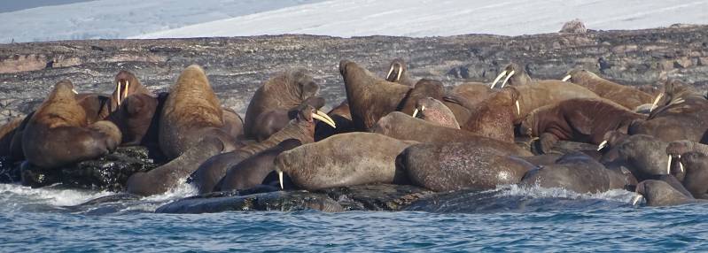 Donderdagochtend 23 augustus hebben we aan de zuidkant van Kvitøya (Andreeneset, 80.05 graden noorderbreedte) maar liefst een drie uur durende zodiaktocht gemaakt om ijsberen en walrussen te spotten. Hele groepen met walrussen, met name mannetjes, lagen hier voor de kust of zwommen in het water. Geweldig om de koppen boven het water te zien! En wat ook heel uniek is dat op deze locatie niet alleen walrussen aanwezig waren, maar ook ijsberen! Aadje kwam echt ogen tekort. Helaas is het op een zodiak heel moeilijk om duidelijken en scherpe foto's/film te maken.