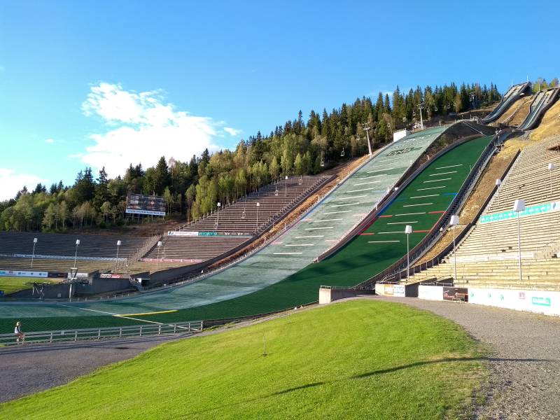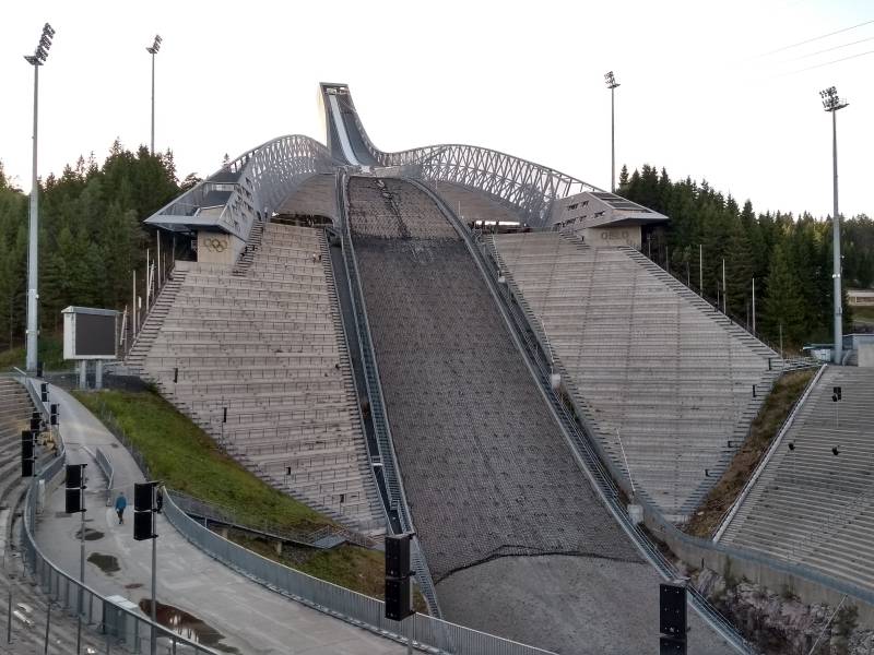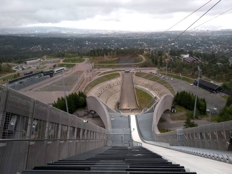 De volgende ochtend op zaterdag 18 augustus heb ik het skimuseum op de Holmenkollen bezocht en natuurlijk ben ik met de lift helemaal omhoog gegaan naar het punt waar de skispringers van de toren naar beneden glijden. Erg indrukwekkend om daar bovenop de schans te staan! Daarnaast een schitterend uitzicht vanaf de schans over de stad.