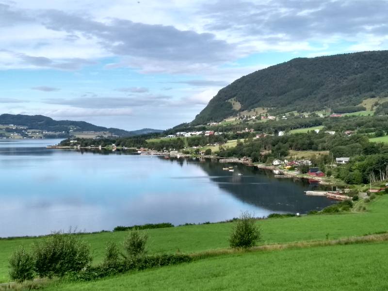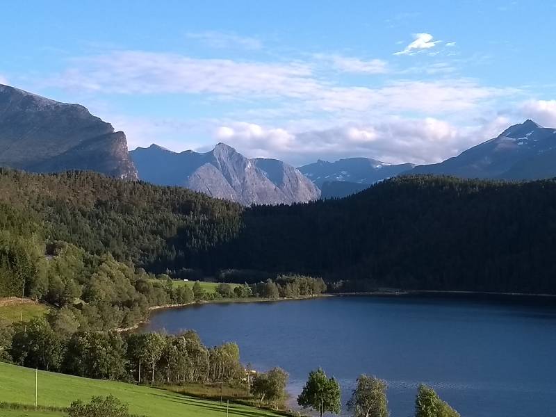 Vervolgens de E136 genomen naar Andalsnes. Dit is een schitterend gebied met stijle bergen aan het water. Om 16.00 uur ben ik aangekomen bij mijn overnachtingsadres het Gjerdset Turistsenter. Ik verblijf 2 nachten in een appartement met balkon. Daar is A3 heerlijk in een tuinstoel geploft met zicht op het water en de stijle bergen. Het was prima weer. Bewolkt, 21 graden en in Dombas een regenbuitje.