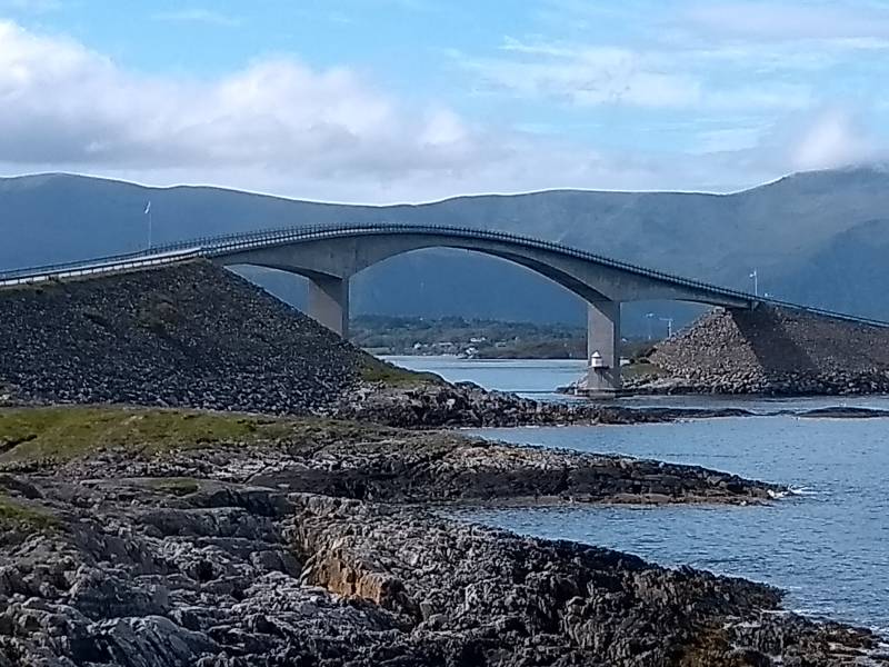 Voor donderdag 9 autustus had ik meerdere opties om uit te kiezen: naar Alesund (stad op meerdere eilandjes in de oceaan) of naar Kristiansund. Het was prima weer en besloot om toch voor de lange route te kiezen naar Kristiansund. Daarom zat Aadje al om kwart voor 9 in de auto. Eerst naar Afarnes om daar de ferry te nemen naar Solsnes. Vervolgens langs Molde naar Vervang. Daar is namelijk het mooiste deel van de Atlantershavsveien: een autoroute van 8,2 km door de Atlantische Oceaan over 8 bruggen. Er zijn vele parkeerplaatsen waar je foto's kunt maken en kunt wandelen langs de oceaan. Ik had er ook nog eens best weer bij, 19 graden en half bewolkt. Bij storm schijnt het helemaal spectaculair te zijn: dan slaan de golven over de de weg en rijd je dus letterlijk door de oceaan! Na alle bruggen ben ik de tunnel van 5,7 km ingedoken naar Kristiansund. Terug heb ik een kortere route genomen naar Molde. Daar ben ik een shoppingcenter ingedoken en heb daar gelijk heerlijk zitten eten (vis!). 11 uur later is Aadje weer neergestreken in de tuinstoel op het balkon!