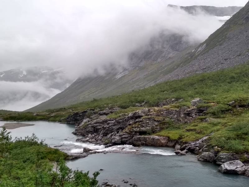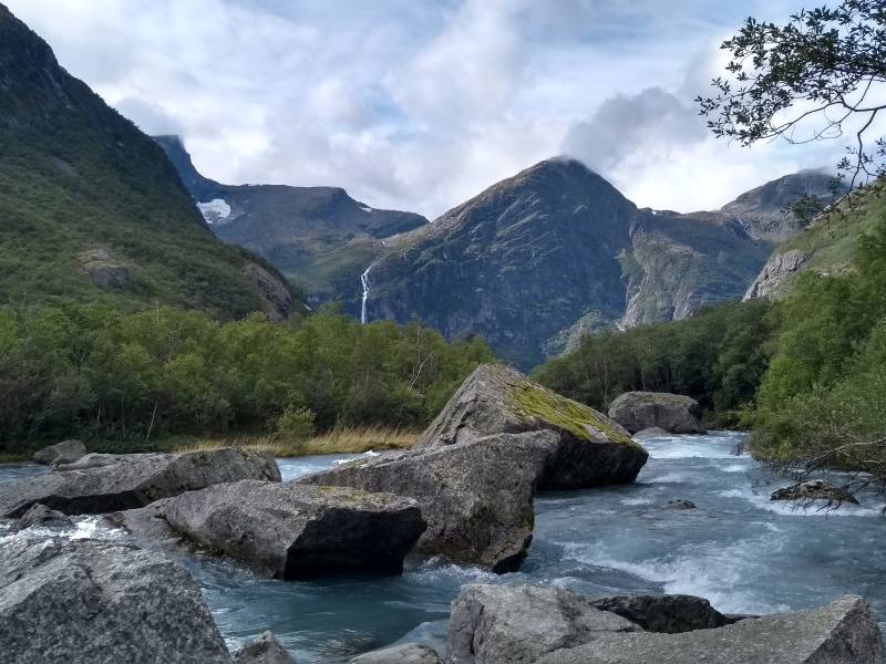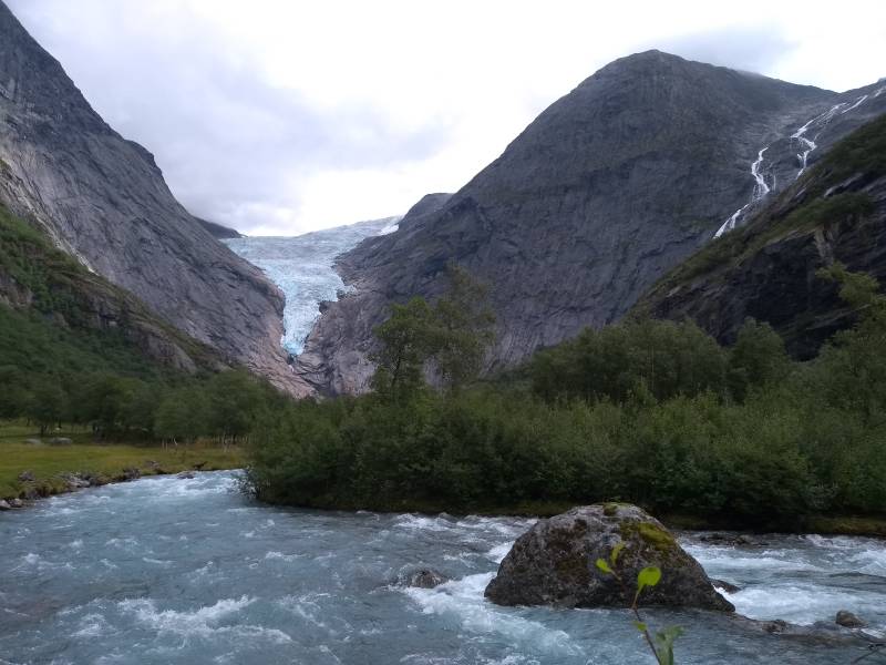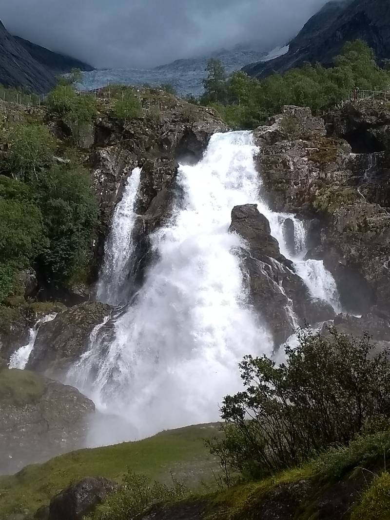 De weg van Olden naar Briksdalsbreen is een erg mooie route om te rijden. Natuurlijk ben ik onderweg een paar keer uit mijn A3 gesprongen om een paar mooie plaatjes te schieten. Vervolgens de auto geparkeerd. Gelukkig waren er niet veel bussen en auto's te bekennen. Bij de Briksdalsbreen een erg mooie wandeling naar de gletsjer gelopen (hoogteverschil zo'n 200 meter). Tijdens de wandeling loop je langs de schitterende waterval de Kleivafossen. Hierbij langslopen met een windje zorgt gegarandeerd voor een nat pak. In mijn geval werd dat een kleffe natte broek! Aan het einde van de wandelroute kon Aadje 10 jaar geleden nog op de gletsjer staan. Helaas is dat nu niet meer mogelijk. De gletsjer ligt nu honderden meters verder en hoger.