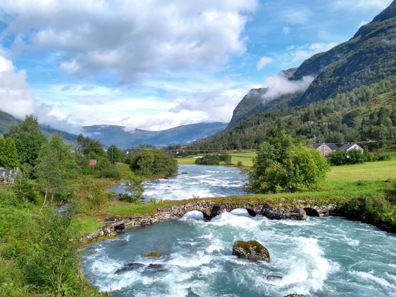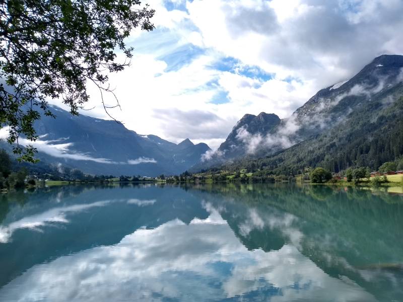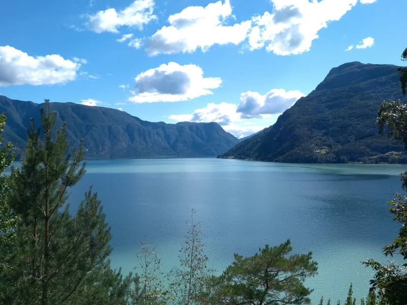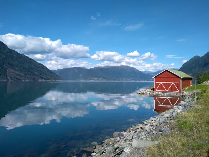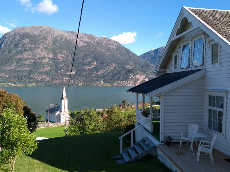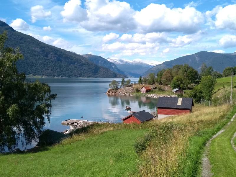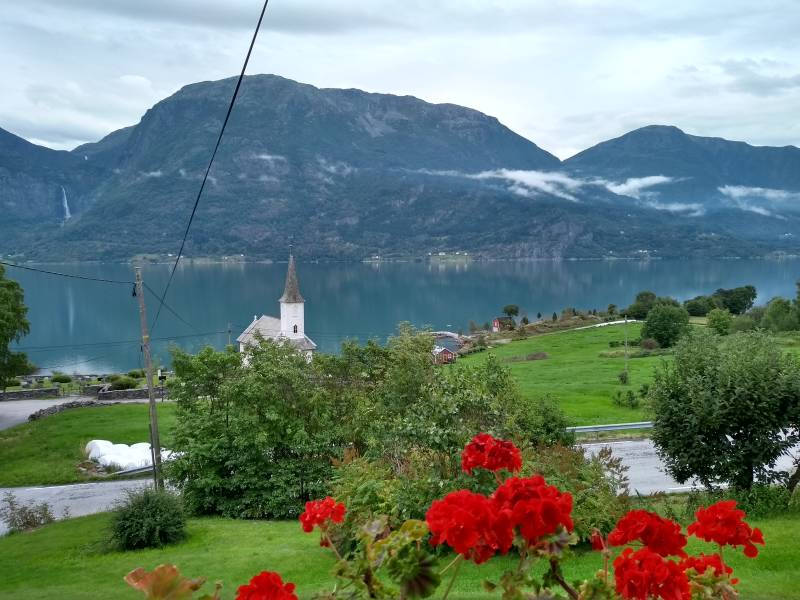 Vanaf woensdag 8 augustus reis ik door een deel van het fjordengebied van Noorwegen. Andalsnes aan de Isfjord, Stryn aan de Innvikfjord (zijtak van de Nordfjord) en op zondag 12 augustus heb ik Stryn verlaten om het gebied rond de Sognefjord te bezoeken. De hele dag in mijn A3 rondgetuft en om 16.00 uur in boerderij Nes Gard in Hoyheimsvik aangekomen. Wat ligt dat mooi zeg zo aan de Lusterfjord! Dit is een zijtak van de Sognefjord (langste en diepste fjord van Noorwegen). Daarnaast ligt het aan de zuidkant van De Jostedalsbreen, dus de kans op beter weer is hier groter. Er scheen dan ook een stralende zon bij aankomst! Aadje verblijft hier vier nachten in een mooie kamer met overdekt terras met schitterend zicht op de kerk, de fjord en de waterval. Daarnaast heb ik hier ook half pension, dus ik kan zo aanschuiven bij het diner!