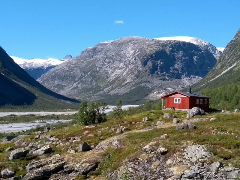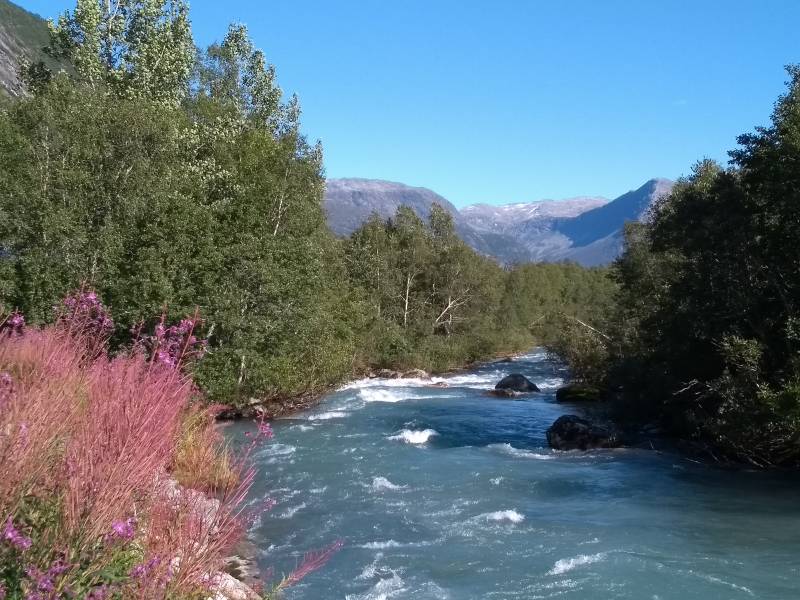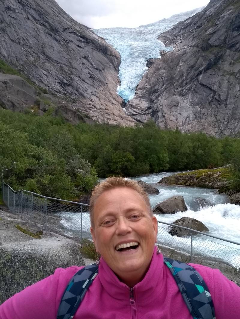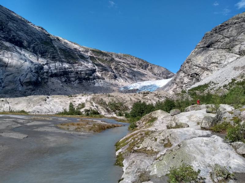 Maandag 13 augustus was het een stralende dag: 18 graden, een strakblauwe lucht en zon! Na een heerlijk ontbijt, om half tien de auto ingestapt. Dit keer was het niet een hele lange rit (50 minuutjes) naar mijn eerste stop de Nigardsbreen. Eerst het bezoekerscentrum bezocht en vervolgens over een tolweg naar het parkeerterrein gereden. Daar heb ik een bootje genomen richting de gletsjer. Om nog dichterbij de gletsjer te komen moest Aadje aardig klimmen en klauteren over de keien, maar het uitzicht was weer erg mooi! Je kunt hier ook een gletsjer wandeltour boeken, maar dat heeft Aadje wel vaker gedaan. Vervolgens ben ik naar het einde van het Jostedal gereden voor een mooi blik over het dal met de diverse gletsjers.