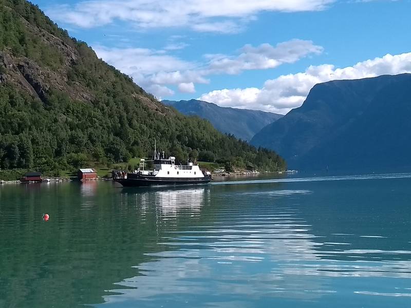 Hier in het fjordengebied kom je natuurlijk heel veel tunnels, bruggen en ferry's tegen. Om het Lusterfjord over te steken moet je dan ook gebruik maken van een ferry. Op dinsdag 14 augustus heb ik een rondje Lusterfjord gedaan. Via wat stops heb ik het historische plaatsje Solvorn aangedaan. Hier staat ook het oudste hotel van Noorwegen. Een keer per uur gaat hier de ferry naar de overkant naar Urnes. Dit keer was het wel een bijzonder klein en smal ferrybootje. Er konden maar 9 auto's op! Aadje mocht als eerste op de ferry, maar dan wel achteruit er op rijden! Dat was wel effe een dingetje. Pffff. Maar de auto is weer heelhuids van de ferry gekomen (nu wel vooruit). Ik heb al heel wat ferry's gehad, maar niet zo'n eentje! Vervolgens een kort bezoekje aan de staafkerk van Urnes gebracht en daarna rond het Lusterfjord gereden. De weg aan de overkant (van Urnes naar Skjolden) is wel bijzonder smal. Als er een auto aankomt moet er vaak 1 achteruitrijden om te kunnen passeren. Langs dit deel van het fjord staan er langs de weg veel stenen paaltjes om te voorkomen dat je het fjord inrijd! Vanaf half 5 nog heerlijk van het zonnetje in de tuin van Nes Gard genoten. En natuurlijk om 7 uur weer aangeschoven bij het diner!