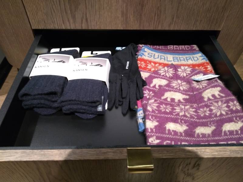 Even voor vier uur is mijn vlucht uit Oslo vertrokken naar Longyearbyen met een tussenstop in Tromso. Om 19.45 uur ben ik geland op de luchthaven Spitsbergen. Een piepkleine luchthaven met 1 bagageband. Lekker overzichtelijk dus! Gelukkig was al gauw al mijn bagage op de band en ben ik met de flybus (75 kronen enkeltje, 125 retour) naar mijn hotel gegaan. Het was de bedoeling dat ik 2 nachten in het Radisson Blu hotel zou zitten, echter ik kreeg gisteren te horen dat ik een upgrade had gekregen naar de Funken Lodge. Omdat het iets verder van het centrum ligt, heb ik van te voren het hotel benaderd en gevraagd voor gratis transfers naar het centrum (1,2 km lopen). En ja hoor, bij aankomst in de lodge heb ik 2 vouchers gekregen voor gratis taxiritten! Deze lodge is onlangs geheel gerenoveerd en ik heb dan ook een supermooie kamer met zelfs vloerverwarming in de douche! Mijn kamer heeft ook een bijzondere minibar, naast drank en nootjes liggen er warme sokken en mutsen in!