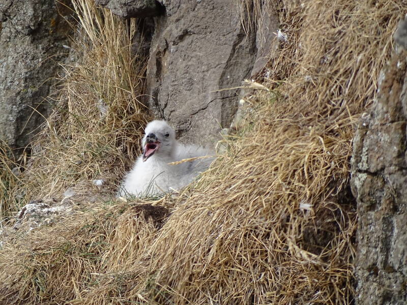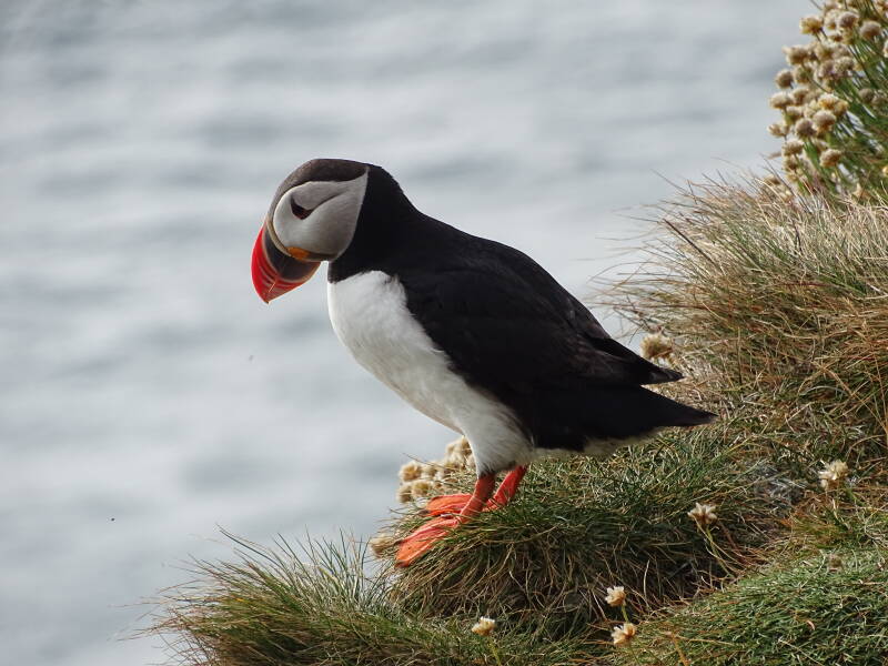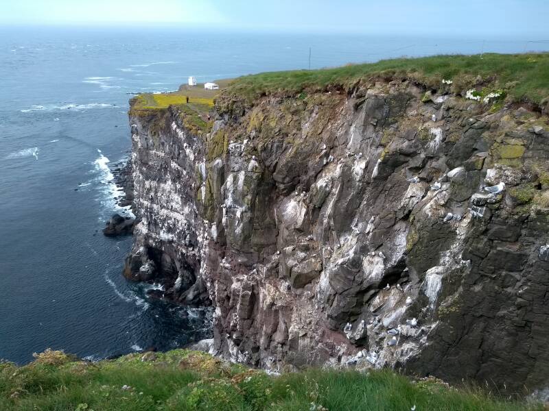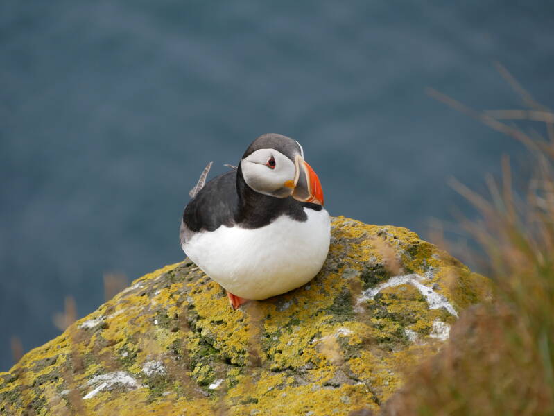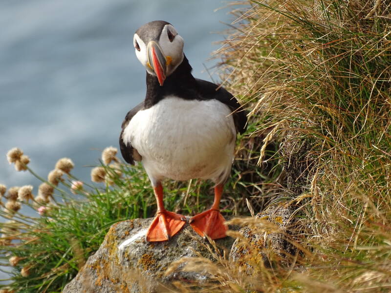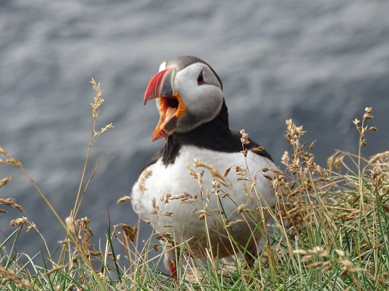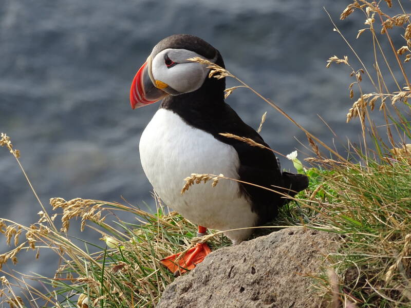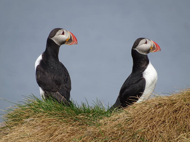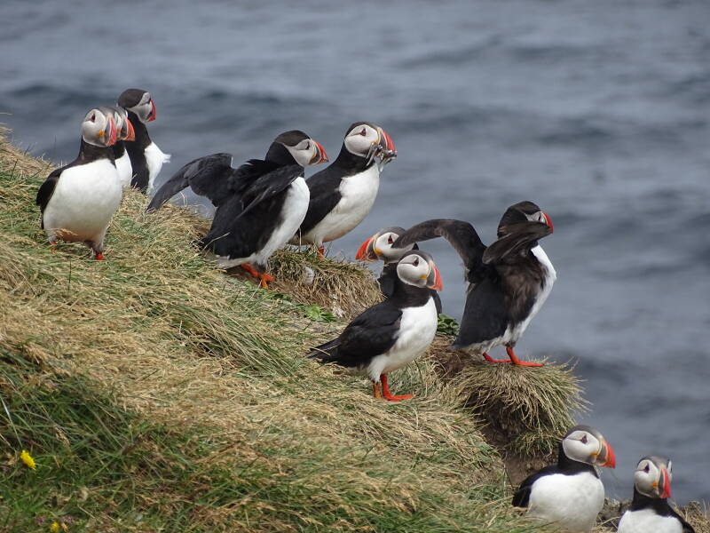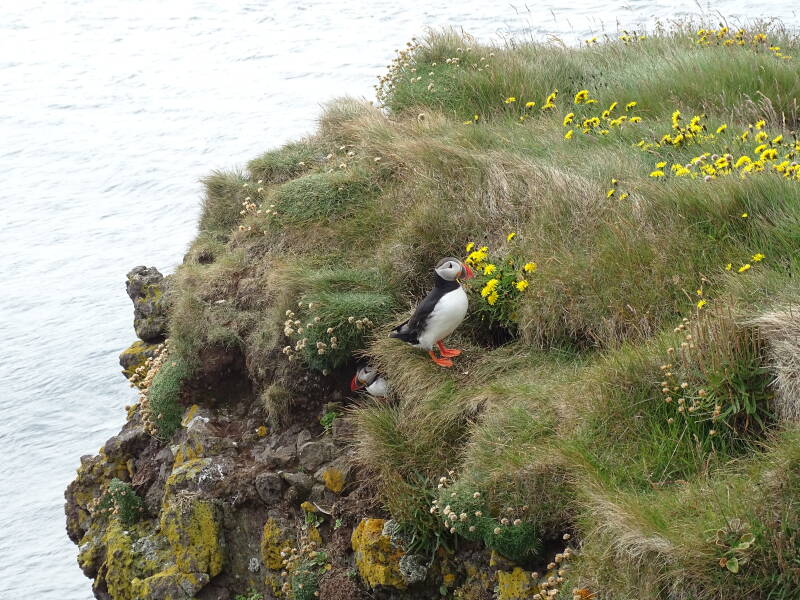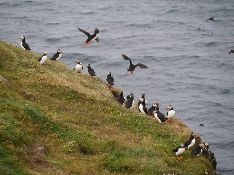 Aadje had thuis gelezen over een stop bij een kolonie papegaaiduikertjes op de Tjörnes peninsula. Nu, daar wilde ik natuurlijk naar toe! Het was eventjes goed kijken, omdat dit niet met borden is aangegeven. Op een gegeven moment had ik de oranje vuurtoren bij Voladalstorfa in het vizier. Bij een hek bij een weiland heb ik de auto achtergelaten en na een half uurtje door het weiland te hebben gelopen zag ik ze toch echt bij de vuurtoren. Echt duizenden puffins, het zag er zwart van. Ze vlogen af en aan. Hele hordes! En natuurlijk heb ik nog maar weer een paar fotootjes geschoten.