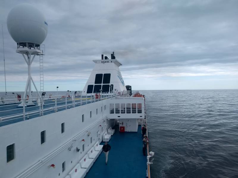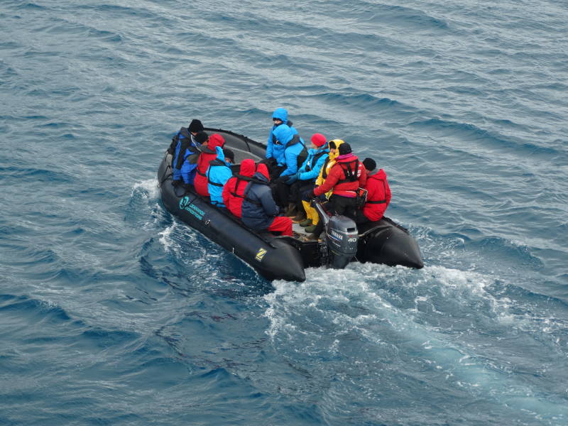 Donderdag 8 augustus hadden we weer een aantal verplichte bijeenkomsten over o.a. de gang van zaken mbt de zodiaks en daarnaast het passen van de rubberen laarzen in het geval dat we een natte landing gaan maken (dan stap je vanaf de zodiak met je voeten in zee😊). Vandaag was het heerlijk weer op zee: zo'n 10/12 graden en maximaal 10 knopen wind (da's bijna niks!). Dus we liggen prima op koers bij het oversteken van de Straat van Denemarken naar Groenland. Natuurlijk heeft Aadje deze dag veel op de dekken gestaan en daarbij spotte zij aantal gewone vinvissen en een groep orka's. Daarnaast zag ik ook al puffin's in het water. Deze hebben hun holletje verlaten en zijn nu circa 8 maanden op zee. Tussen het spotten van de walvissen door ben ik ook nog verhuisd naar hutnr. 411: een tweepersoonshut met een ruimere douche!