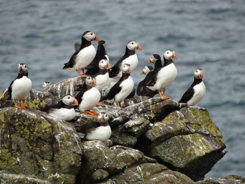 Op het eilandje hebben we een stuk gewandeld (het was voor mij meer klauteren op handen en voeten) en daarnaast hadden we ook tijd om een aantal puffins op de foto te zetten! Het bootje zou weer om kwart voor 12 vertrekken, echter ik heb kunnen regelen dat ik om 16.00 uur met de middaggroep mee terug kon. Aadje had zo alle tijd om van alle puffins te genieten en een flink aantal op de foto te zetten. Daarnaast zitten er hier o.a. ook noordse sternen, kleine jagers (Skua), strandlopers en kuifaalscholvers. Stipt om 4 uur werd ik weer opgehaald. Bleek ik de enige passagier te zijn!