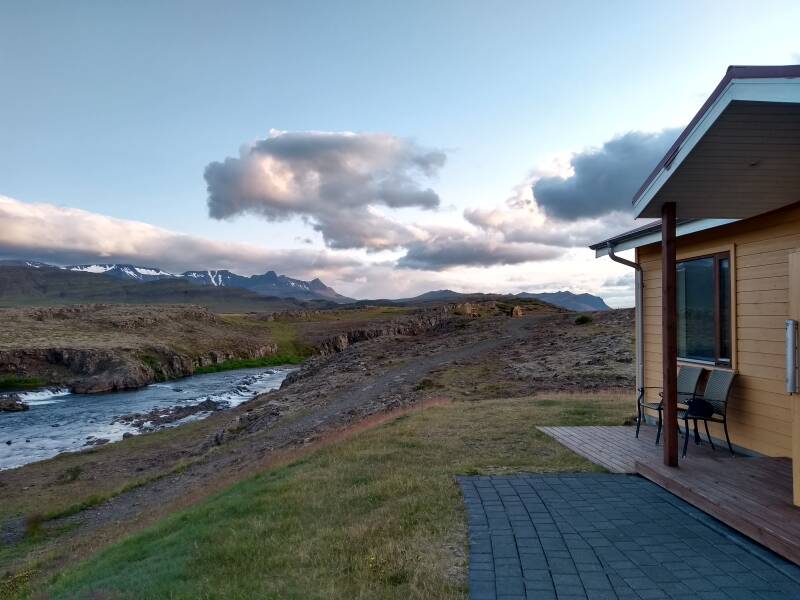 In de omgeving van de luchthaven leek het wel een maanlandschap, rond Reykjavik op ringweg nr. 1 was het veel groener en de weg naar mijn eindbestemming van vandaag waren er veel IJslandse paardjes te bekennen. Ik zit dit keer in een heel leuk onderkomen: het mooist gelegen huisje (kamernr. 1) van het Fossatun Country Hotel met een leuk terrasje en zo bij kleine watervalletjes. Na een paar bakken thee en een heerlijke douche mijn bed maar ingedoken.