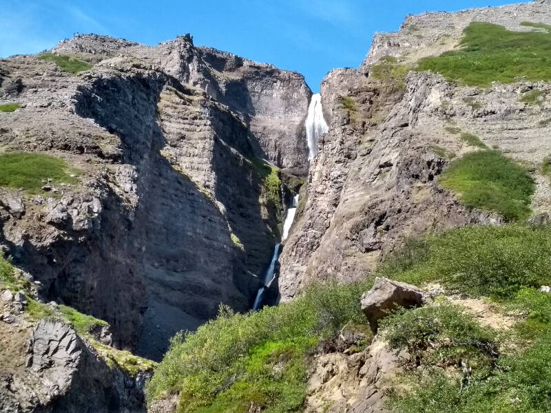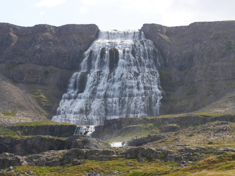 Dinsdagochtend 30 juli ben ik een keertje wat later bij het ontbijtbuffet aangeschoven. Er stond maar een rit van zo'n 120 km op het programma, dus een lekkere rustige reisdag! Bij het vertrek uit Flokalundur, aan de zuidkant van de Westfjorden, waaide het flink maar het was zeker niet koud. De rit startte met maar liefst 60 km aan gravelwegen door een bijzonder landschap dat doet denken aan de Schotse Hooglanden, een bergwoestijn en de Noorse fjorden. Omdat het flink waaide (windkracht 6) was het niet zo aantrekkelijk om veel te stoppen. Door al het gravel en het kale landschap werd het dan meer stofhappen! Wel heb ik halverwege een lange stop gemaakt bij de 99 meter hoge Dynjandi waterval. Aan het einde van de autorit nog even door een ruim 9 km lange tunnel. Rond 3 uur is Aadje aangekomen op de eindbestemming van deze dag: Isafjordur (circa 2600 inwoners). Dit is de grootste plaats in de Westfjorden. Het hotel lag zo in het centrum en in tegenstelling tot vanmorgen waaide het maar een beetje en was het zo'n 18 graden. Ik heb dan ook heerlijk buiten in het zonnetje op een terrasje heilbot gegeten. Voor de komende dagen ziet de weersvoorspelling er ook goed uit.