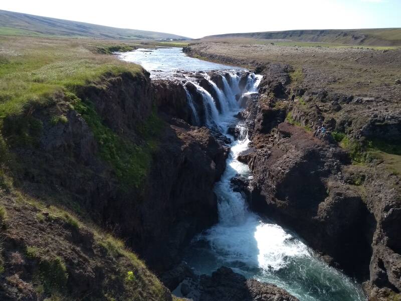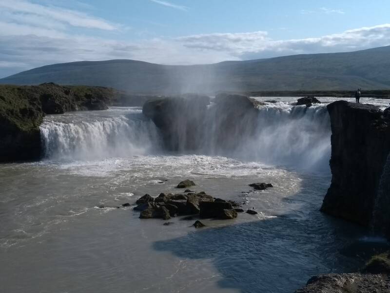 Natuurlijk liggen er ook weer een aantal bezienswaardigheden op deze route. Als eerste een stop bij de Kolugljufur. Da's een canyon met waterval natuurlijk! Vervolgens naar Akureyri geweest; de op één na grootste stad van IJsland. Ten slotte nog een stop bij een waterval: de Godafoss. Na zo'n 300 km (er staat inmiddels al ruim 1500 km op de teller) ben ik rond 7 uur aangekomen bij het muggenmeer. Ik zit in een mooi nieuw hotel waar ik dit keer 3 nachtjes verblijf.