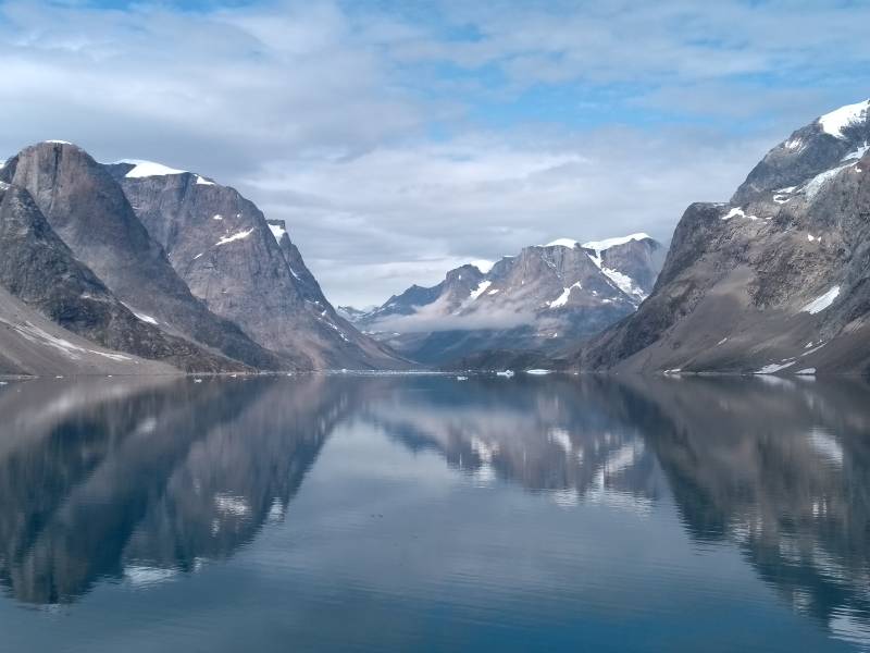Zondagochtend 11 augustus stond Aadje al weer vroeg buiten op de dekken. Deze ochtend was er een dik wolkendek, soms miezerde het en het was 8 graden. Ik heb maar lekker mijn dikke skibroek met daaronder een thermolaag aangedaan; dan kunnen we er weer flink tegen aan! Het schip is aan de oostkust van Groenland bijna tot aan de zuidpunt gevaren. Vlak voor dit punt is de Ocean Atlantic de Prins Christian Sund ingevaren. Dit is een 45 km lange doorgang naar de westkant van Groenland. Na een paar kilometer trok de bewolking weg, kwam de zon tevoorschijn en verschenen er stijle bergen met daarop gletsjers. Ook waren er watervallen en ijsbergen te bewonderen. Daarnaast werd er zelfs in het fjord een groep orka's gespot, wat niet vaak voorkomt.