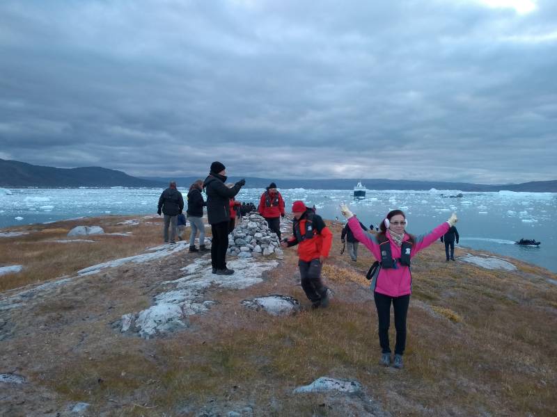 De passagiers zijn deze reis voor de zodiaklandingen in 7 groepen verdeeld: 6 Deense groepen (zo'n 150 gasten) en 1 internationale groep. De eerste zodiaklanding was in het plaatsje Tasiilaq. En ja hoor .... op vrijdag 9 augustus om 9.57 uur was het eindelijk zover.... Aadje zette haar eerste voetstappen op Groenland!