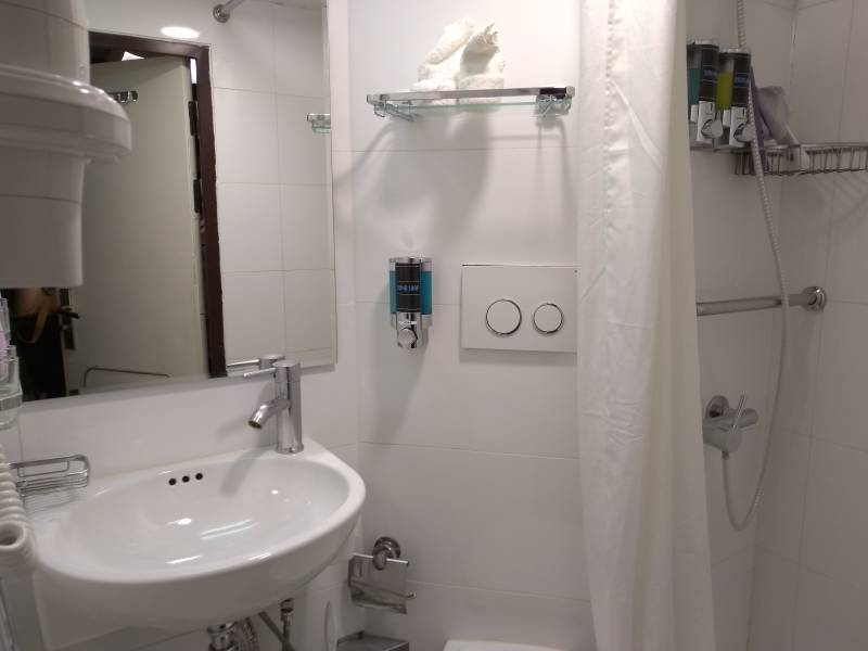 Maar op woensdagmiddag 2 uur was het eindelijk zover. Aadje mag aan boord van de Ocean Atlantic! Dit keer is het een wat groter expeditieschip. Bij mijn vorige expeditiescheepsreizen zaten er ruim 100 gasten aan boord, nu zijn dat er circa 180. Bij aankomst inchecken in de Viking Lounge en vervolgens mijn hut voor 12 dagen opgezocht. Prima hut, nr 417. Wel een smal éénpersoonsbed en een smalle douche, maar wel heel veel opbergruimte voor alle bagage. Om 5 uur door naar de veiligheidsinstructie. Tsja dat is toch op alle schepen hetzelfde!